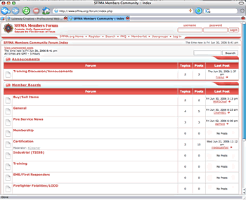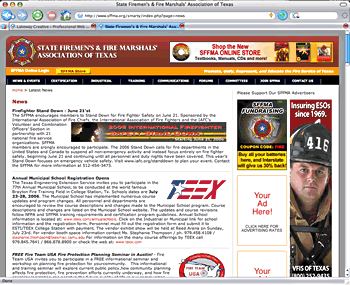 | The State Firemens and Fire Marshals' Association of Texas web site was redesigned and launched in April 2006. The new site features drop down menu navigation accessible from almost anywhere on the site, integration of advertisements on inside pages, an interactive calendar and forum community. |